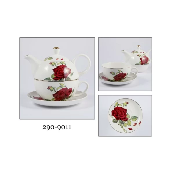 Trzy elementowy, porcelanowy komplet w kolorze złamanej bieli z piękną czerwoną różą, do herbaty dla jednej osoby - Tea For One. Komplet składa się z dzbanuszka, filiżanki oraz spodka. W dzbanuszku zaparzysz herbatę i w elegancki sposób podasz np. mamie lub przyjaciółce podczas spotkania na herbatę.