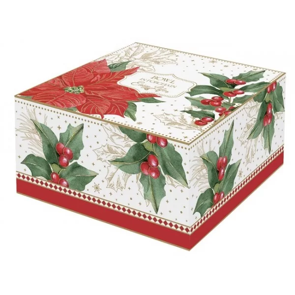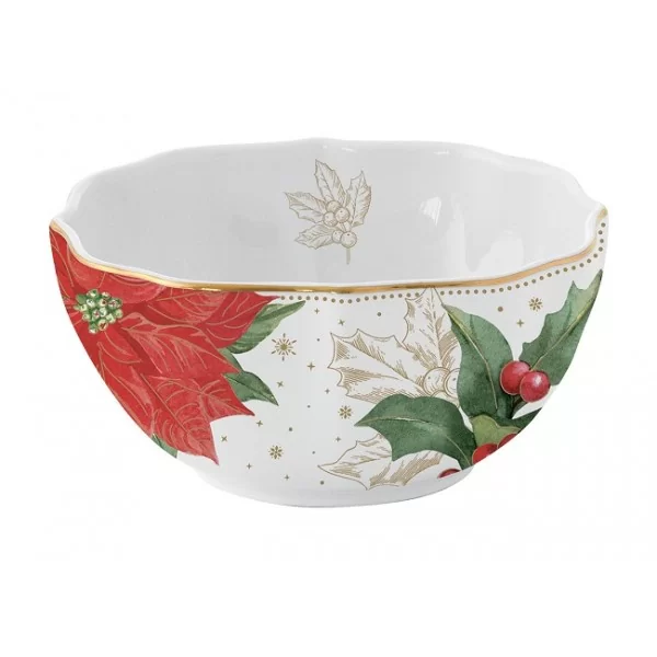Porcelanowa miseczka o średnicy 12 cm z motywem Gwiazdy Betlejemskiej i ostrokrzewu. Będzie pięknie prezentowała się podczas Świąt jako miseczka na przystawki, pikle albo sałatki.