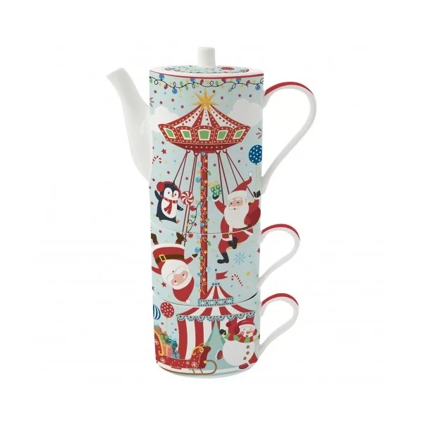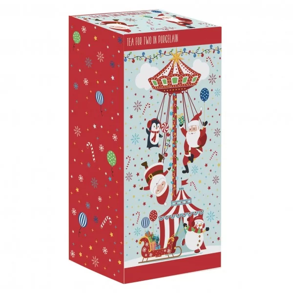 Idealny komplet dwóch kubków i czajniczka do herbatki we dwoje. Zestaw piramidka tzw. tea for two ułożony w odpowiedniej kolejności jeden na drugim utworzą oryginalną piramidkę z wesołym motywem świątecznym. Zestaw umili zarówno czas świąteczny jak i ten przedświąteczny.