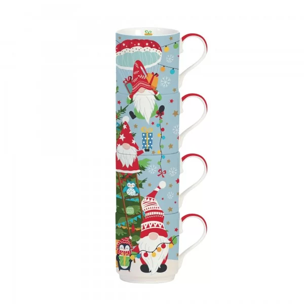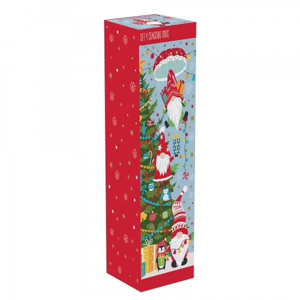 Zestaw piramidka czterech kubków o pojemności 275 ml, ułożony w odpowiedniej kolejności jeden na drugim utworzą oryginalną piramidkę z motywem świątecznych skrzatów. Zestaw umili zarówno czas świąteczny jak i ten przedświąteczny.