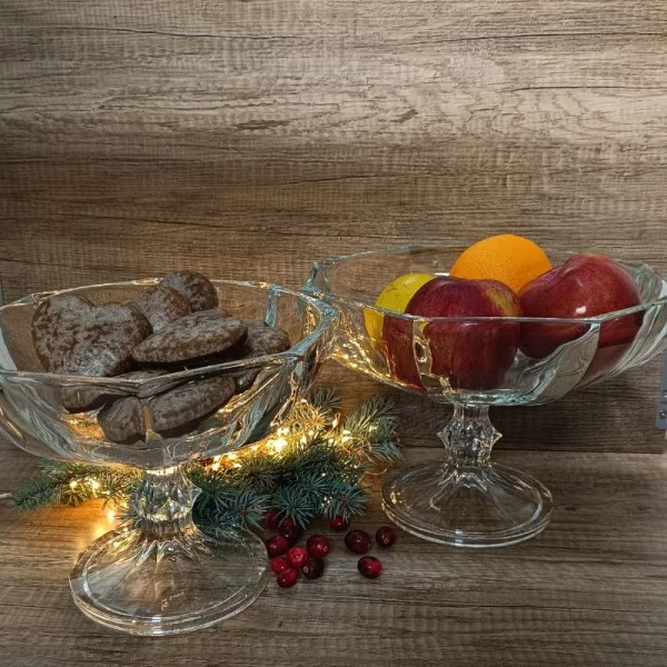 Komplet dwóch owocarek na nodze wykonanych z krystaliny. Doskonale nadadzą się do ciastek i owoców. Producentem jest polska huta szkła IRENA.