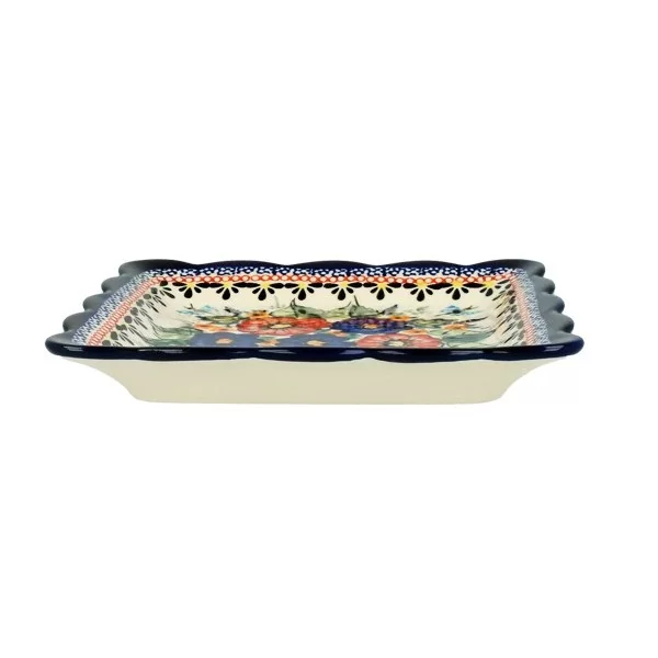 Kwadratowy talerz z falistym brzegiem. Idealny do serwowania przekąsek i deserów. Produkt wykonany z glinki ceramicznej, ręcznie formowany i dekorowany w Zakładach Ceramicznych w Bolesławcu. Symbol kształtu: GU 1610. Dekoracja nr 149Art wchodzi w skład grupy artystycznej Ceramiki Bolesławieckiej. Naczynia w tym wzorze dekorowane są ręcznie, za pomocą stempli i pędzla. Szkliwienie sprawia, że ceramika jest bardziej odporna na zabrudzenia, ma niską absorpcję wody i jest łatwiejsza w czyszczeniu. Może być bezpiecznie używana w zmywarce i mikrofalówce. Dodatkową zaletą jest brak szkodliwych substancji w składzie produktu.