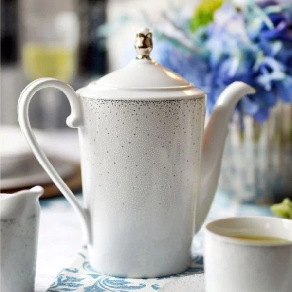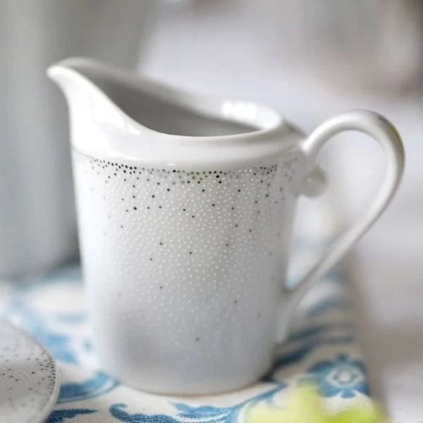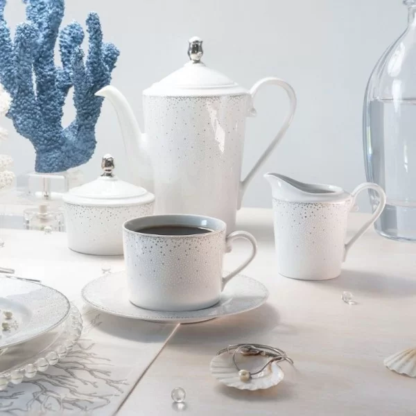 Garnitur do kawy 6-osobowy 18 elementów. Zestaw do kawy Jenny Pearls, łączy w sobie prostotę swojej formy z wyjątkowym zdobieniem. Jenny to fason, który wyróżnia się tradycyjną linią i stylistyką nawiązującą do lat 60. i 70. Dekoracja Pearls dodaje mu blasku i uroku, dzięki akcentom przypominającym błysk iskrzących pereł na śnieżnobiałej porcelanie.