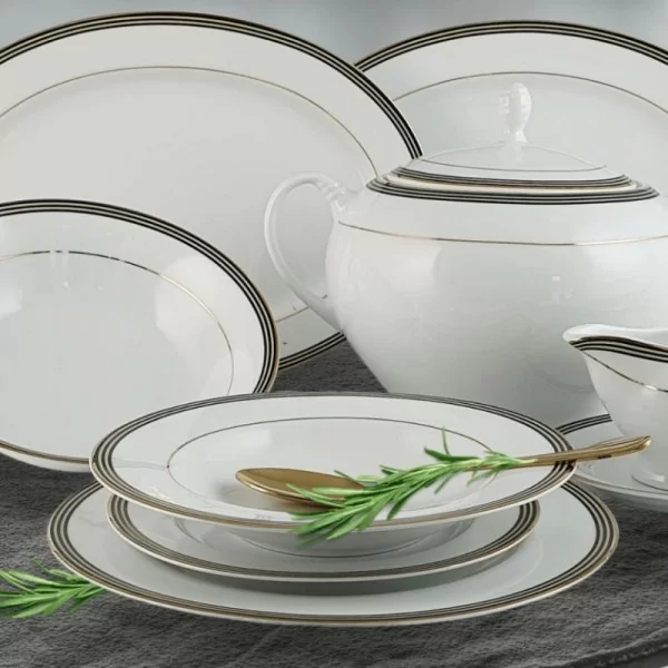 Zapraszamy do odkrycia eleganckiego serwisu obiadowego OFELIA GOLD, który zapewni wyjątkową przyjemność użytkowania podczas codziennych posiłków oraz wyjątkowych okazji. Wykonany z gładkiej porcelany, ten 24-elementowy zestaw zachwyca nie tylko estetyką, ale także doskonałymi właściwościami przewodnictwa termicznego.