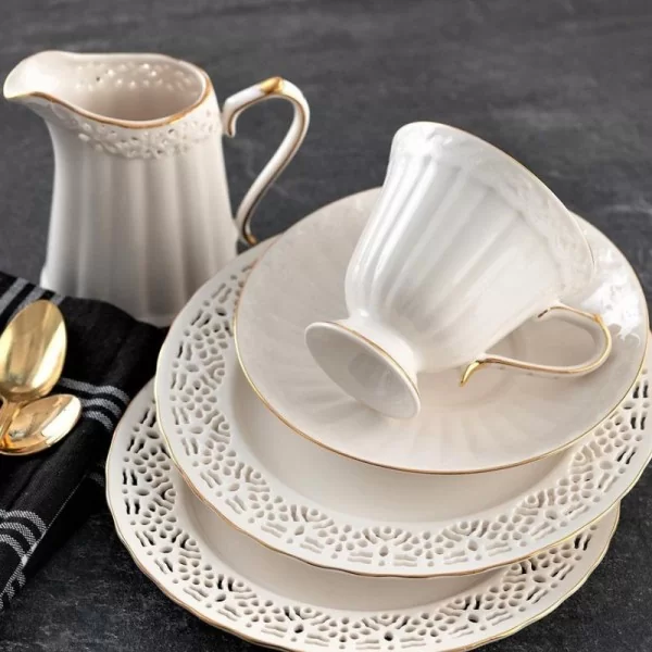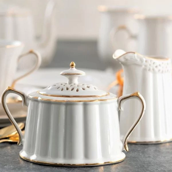 Zapraszamy do odkrycia serwisu do herbaty na 6 osób Clara Gold Ivory. Ten wyjątkowy zestaw z kolekcji porcelany kremowej zachwyca klasycznym stylem i niezwykłą elegancją. Naczynia serwisu wyróżniają się wysmukłym kształtem oraz delikatnym tłoczeniem, które dodają im wyrafinowanego charakteru. Misterna, ręcznie wycinana ażurowa koronka nadaje im unikalnego uroku.