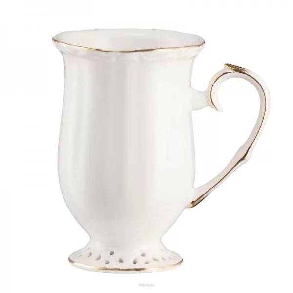 Kubek do kawy lub herbaty Clara Gold Ivory oferuje niepowtarzalny design i elegancję, której poszukujesz. Wyjątkowy kształt, delikatne tłoczenie i misterna ażurowa koronka wykonana ręcznie nadają mu wyjątkowy urok. Z kolei ręcznie malowana złota linia na obrzeżach oraz stylowe stopki dodają mu luksusowego wykończenia.