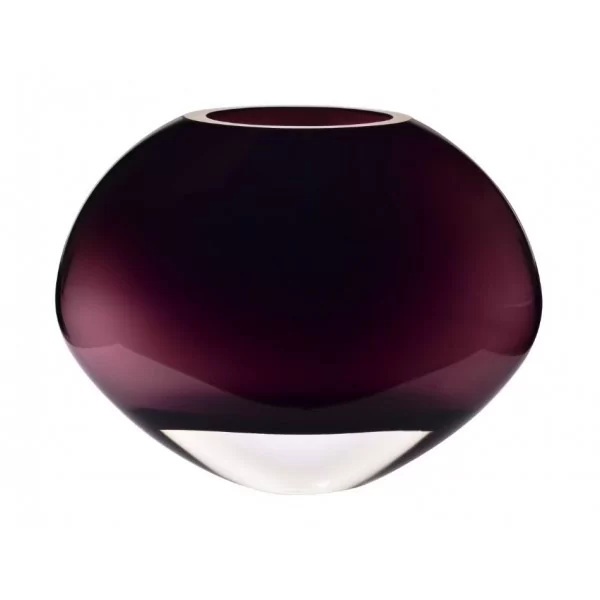 Okrągły, płaski wazon wykonany z ciemnofioletowego szkła to unikat i wyjątkowe dzieło sztuki hutniczej. Wazon wykonany z grubego szkła zwraca uwagę nowoczesną formą i sporym rozmiarem. Wazon ma wysokość 21 cm przy szerokości 27,5 cm.