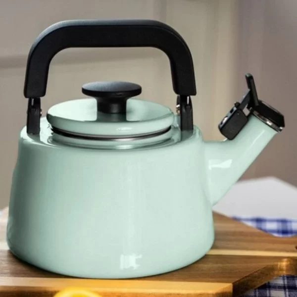 Wykonany z najwyższej jakości materiałów. Emalia jest nakładana ręcznie z dbałością o szczegóły. Czajnik wytwornie się prezentuje i zachwyca elegancją. Gwizdek unoszony mechanicznie można ustawić w pozycji otwartej (nie opada), co pozwala wlewać wodę do czajnika bez podnoszenia pokrywki.