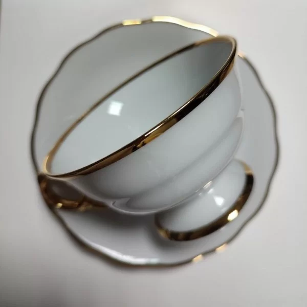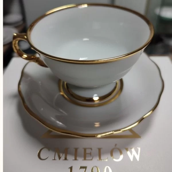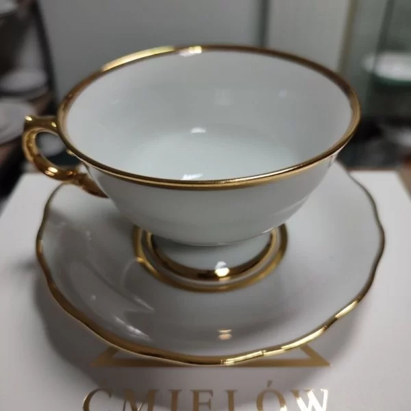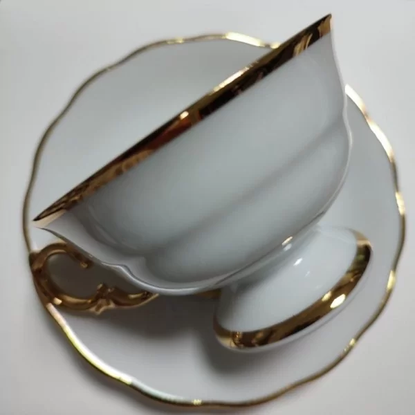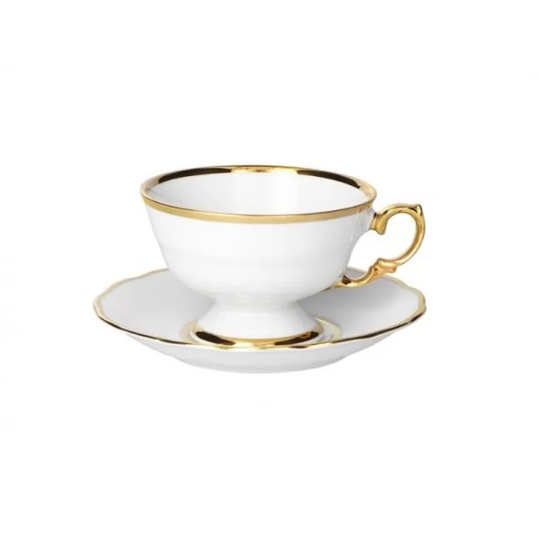 Filiżanka do herbaty Alaska Dzień to doskonały wybór dla miłośników klasycznej porcelany o wyjątkowej formie. Eleganckie, ręcznie malowane złotem ucho nie tylko zachwyca wyglądem, ale również zapewnia wygodę użytkowania. Klasyczna forma niskiej filiżanki na nóżce została urozmaicona lekko nieregularnym spodkiem, co nadaje jej unikalny charakter. Filiżanka Alaska Dzień dostępna jest w eleganckiej bieli, z wykończeniem z wysokokaratowego złota.