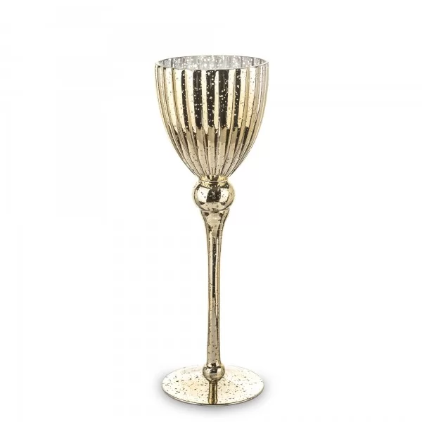 Szklany świecznik dekoracyjny w kształcie kielicha na wysmukłej nóżce elegancko podkreśli oprawę stołu. Złoto brązowe zdobienia pięknie podkreśla światło świecy. Wysoki świecznik bankietowy to doskonały dodatek, który pasuje zarówno do klasycznych, jak i nowoczesnych wnętrz, elegancko podkreślający odświętną atmosferę spotkania przy stole.
