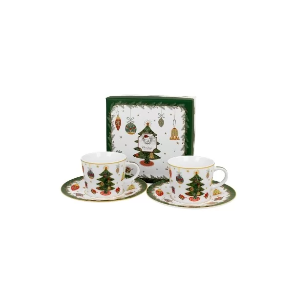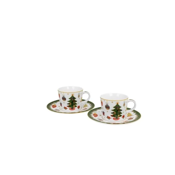 Komplet dwóch filiżanek espresso ze spodkami AROUND CHRISTMAS TREE wchodzący w skład serii Świątecznej, wykonany z porcelany New Bone China, charakteryzującej się elegancką i naturalną kremowo - białą barwą z delikatnym połyskiem, a także wyjątkową wytrzymałością.