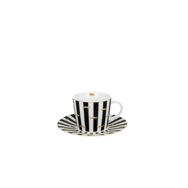 Filiżanka zdobiona wzorem złotych wąsów na tle granatowo - białych pasów.
