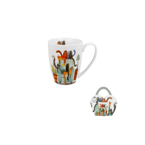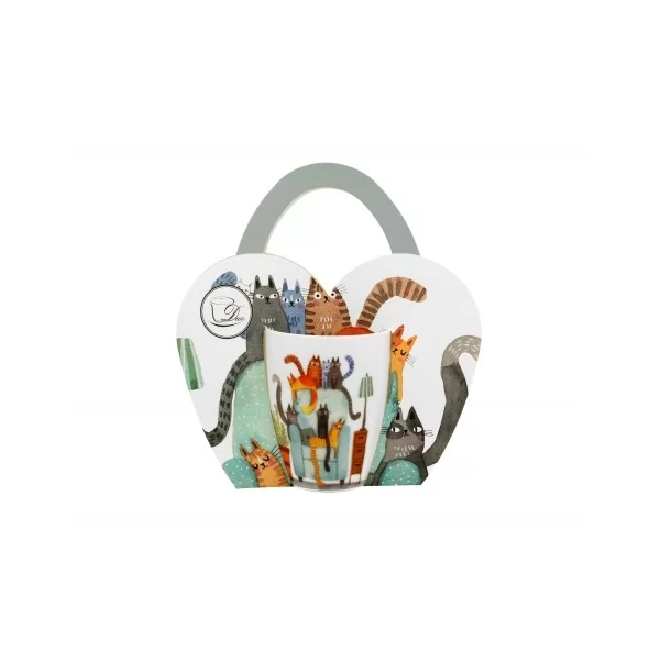 Kubek classic w "koszyczku" Koci Świat KOTY NA FOTELU wchodzący w skład serii Animals, wykonany z porcelany New Bone China, która charakteryzuje się naturalnym kremowo-białym kolorem z delikatnym połyskiem oraz wyjątkową wytrzymałością i trwałością, zachowując lekkość i finezję.