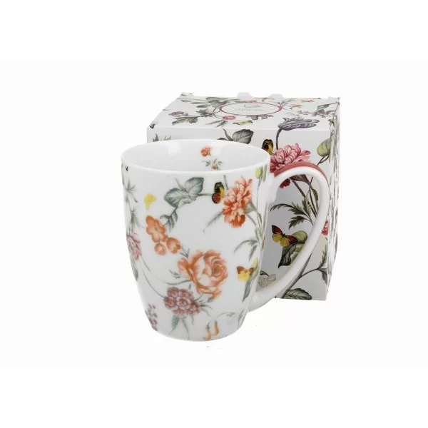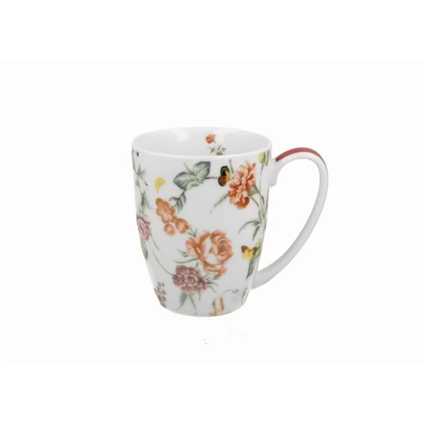 Kubek wykonano z wysokiej jakości porcelany New Bone China, która charakteryzuje się delikatnym połyskiem i wyjątkową wytrzymałością. Ma praktyczną pojemność i klasyczny kształt. Kwieciste zdobienie dodaje mu uroku. Idealny prezent dla bliskiej osoby lub uzupełnienie własnej zastawy.