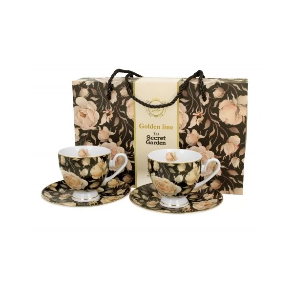 Komplet dwóch filiżanek na stopce ze spodkami ENGLISH ROSES BLACK - Golden Line wchodząca w skład serii Golden Line, wykonany z porcelany New Bone China, charakteryzującej się elegancką i naturalną kremowo - białą barwą z delikatnym połyskiem, a także wyjątkową wytrzymałością.