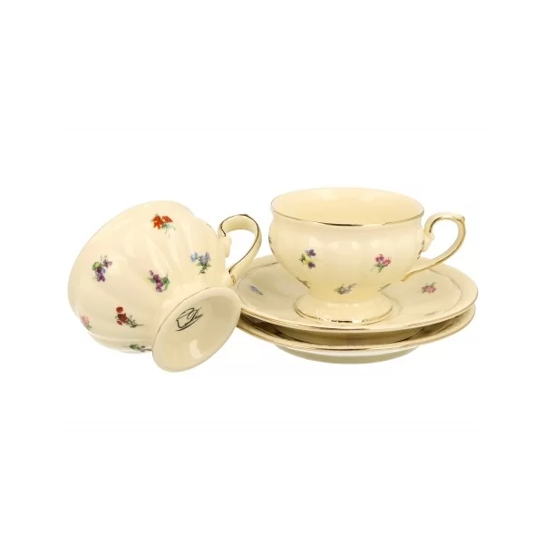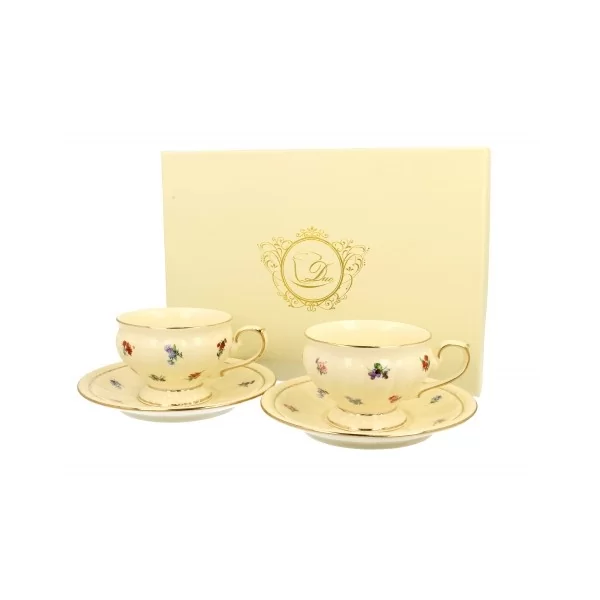 Komplet dwóch filiżanek ze spodkami ENGLAND wchodzący w skład kolekcji ECRU. Linia wykonana z najwyższej jakości porcelany w kolorze śmietankowym wykończonej złotymi zdobieniami oraz delikatnymi kwiatuszkami. Klasyczna stylistyka zadowoli najbardziej wymagające gusta. Całość zapakowana w eleganckie ozdobne opakowanie stanowi doskonały pomysł na prezent.