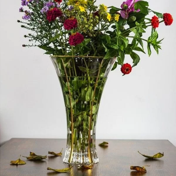 Dekoracyjny wazon Timeless Gold wykonany z ekologicznego szkła kryształowego Luxion, to elegancki i wszechstronny dodatek do wnętrz. Charakteryzuje się wyjątkowym linearnym wzorem ze zdobionymi złotymi elementami, nadając mu nowoczesny i wyrafinowany wygląd. Wazon doskonale nadaje się do eksponowania zarówno żywych, jak i sztucznych kwiatów, a także sezonowych dekoracji, takich jak gałązki jarzębiny czy bukiety z jesiennych liści.