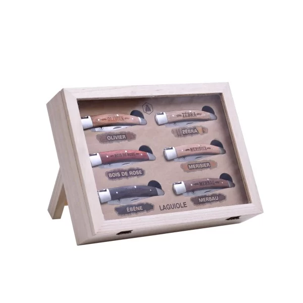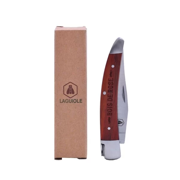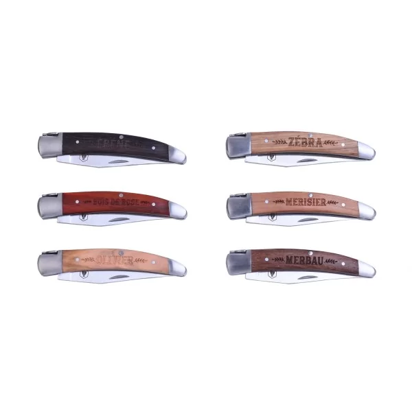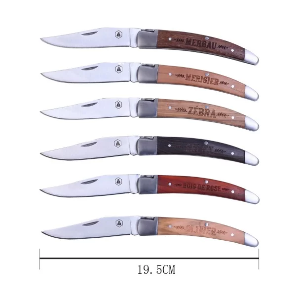 Nóż składany w drewnianej rękojeści. Wielkość noży około 11,5 x 2,4 x 1,8. Długość ostrza 8 cm. Wszystko pakowane w tekturowe pudełeczko.