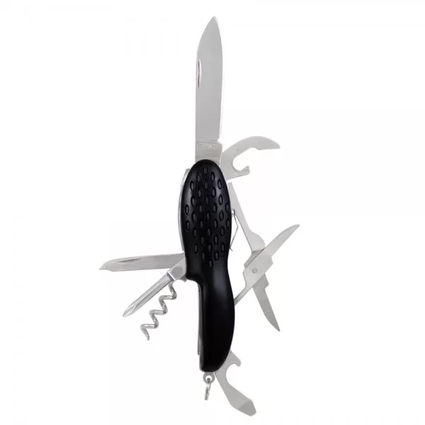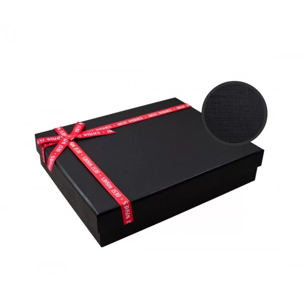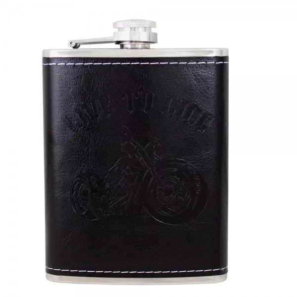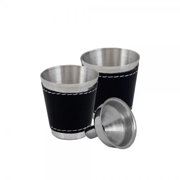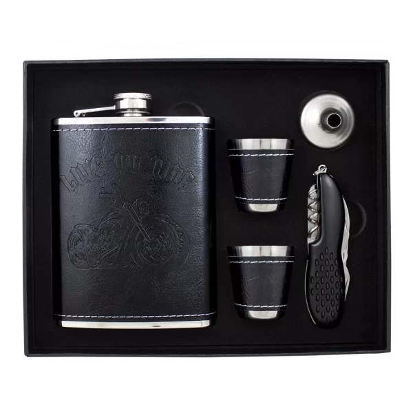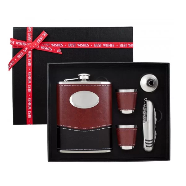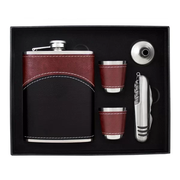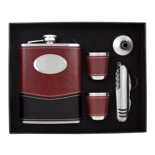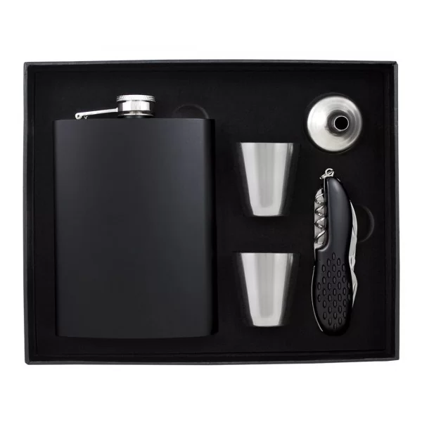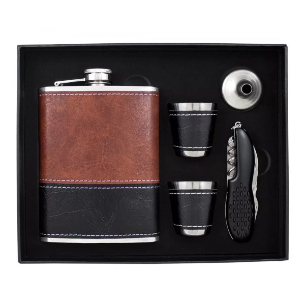 Pięcioczęściowy zestaw: piersiówka z elementem elipsy do graweru, o pojemności 240 ml ze stali szlachetnej, dwa kieliszki, lejek i wielofunkcyjny scyzoryk. Piersiówka i kieliszki oprawione czarną i brązową eko-skórę. Zestaw zapakowany w ozdobne pudełko.