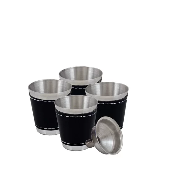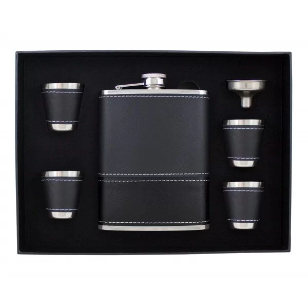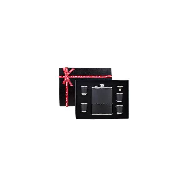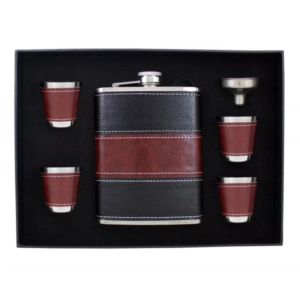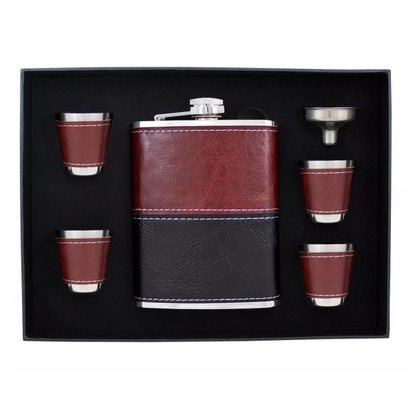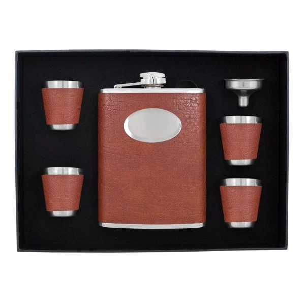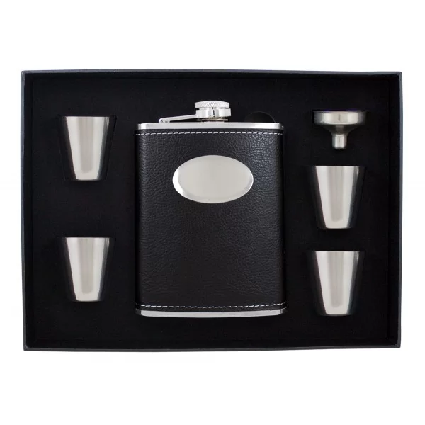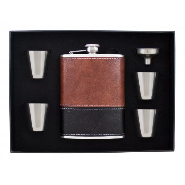 Sześcioczęściowy zestaw zawierający piersiówkę, o pojemności 240 ml, wykonaną ze stali szlachetnej, cztery kieliszki oraz lejek. Piersiówka oprawiona w brązowa eko-skórę do graweru. Zestaw zapakowany w ozdobne pudełko z tasiemką.