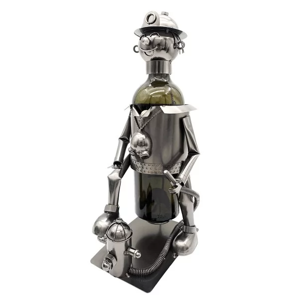 Stojak na butelkę w kształcie strażaka trzymającego wąż gaśniczy. Stojak wykonany został z najwyższej jakości stali. Przystosowany do różnej wysokości butelek, których średnica nie przekracza 7,7 cm. Produkt pakowany jest w białe, kartonowe pudełko.