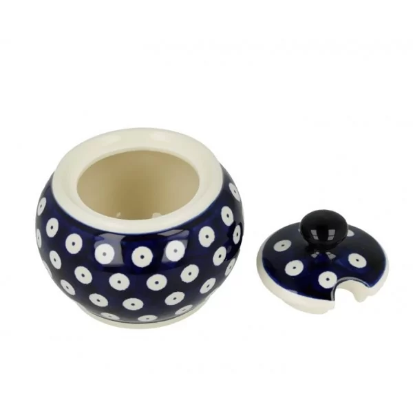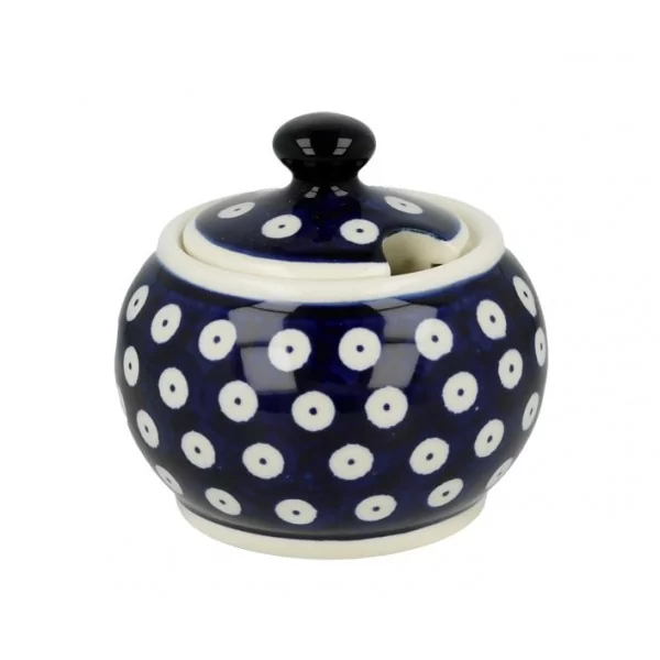 Okrągła cukiernica w klasycznym kształcie o pojemności 150 ml od Zakładów Ceramicznych Bolesławiec. Pokrywka cukiernicy posiada otwór na łyżkę.