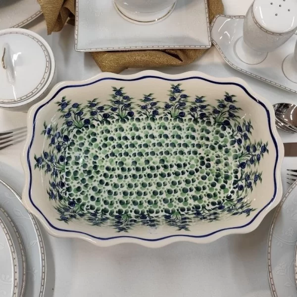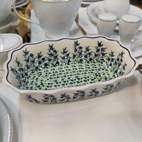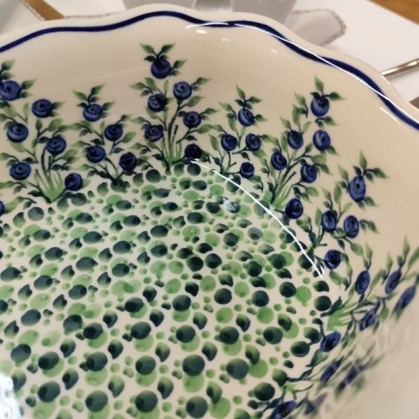 Ceramiczny półmisek z pofalowanymi brzegami o pojemności 1,7l w dekoracji 1208 jagody od Zakładów Ceramicznych Bolesławiec.