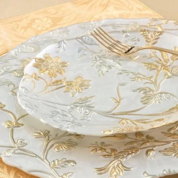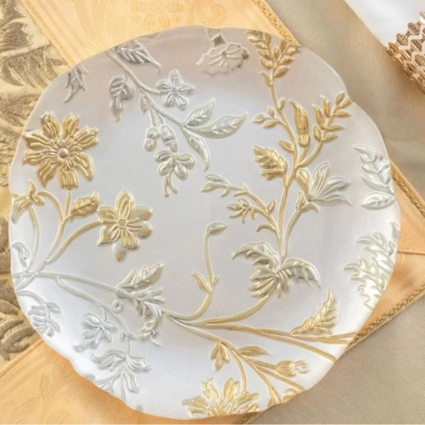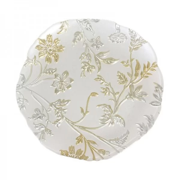 Talerzyk uformowany ze szkła i zdobiony tłoczonym wzorem roślinnym. Tło talerza malowane jest w odcieniu perłowej bieli. Odcienie złota i srebra są stonowane, doskonale dobrane, co nadaje talerzowi elegancji. Cała dekoracja nakładana jest ręcznie, co stanowi o niepowtarzalności każdego talerzyka. Naniesiona jest na spodniej stronie talerza, dzięki czemu jego gładka, szklana powierzchnia jest łatwa do mycia.