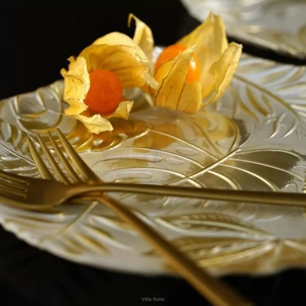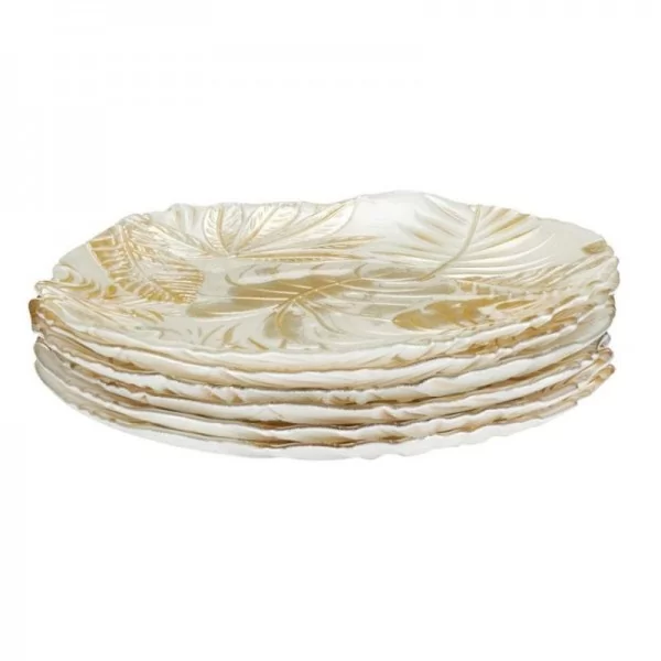 Ręcznie wykonany talerzyk deserowy z wytłaczanym wzorem roślin tropikalnych. Perłowe wykończenie i wzór malowany stonowanym odcieniem złota tworzą niezwykły efekt dekoracyjny. Na uwagę zasługuje nieregularny brzeg talerza nadający mu niepowtarzalny wygląd. Dekoracja naniesiona jest od spodu, dzięki czemu gładką powierzchnię talerzyków łatwo jest utrzymać w czystości.