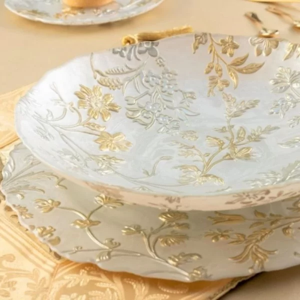 Misa dekoracyjna na owoce, wykonana ze szkła, zdobiona ręcznie wzorem o tematyce roślinnej. Dekorowana jest jasnymi, stonowanymi odcieniami srebra i złota na perłowym tle. Misa szklana Roslin jest doskonała na owoce lub słodycze. Będzie wspaniałą dekoracją wnętrza, nawet podczas wyjątkowych, uroczystych okazji.