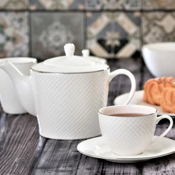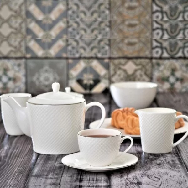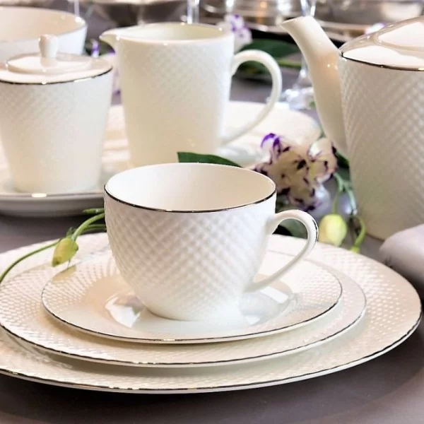 Bari Platin to niezwykle elegancka kolekcja, wykonana z cienkiej i delikatnej porcelany kostnej o ciepłym, mlecznym odcieniu bieli. Serwis do herbaty i pozostałe elementy kolekcji wyróżnia wyjątkowe zdobienie - strukturalny wzór na powierzchni naczyń. Platynowa linia na obrzeżu, malowana ręcznie, subtelnie podkreśla wyjątkowy charakter zastawy.