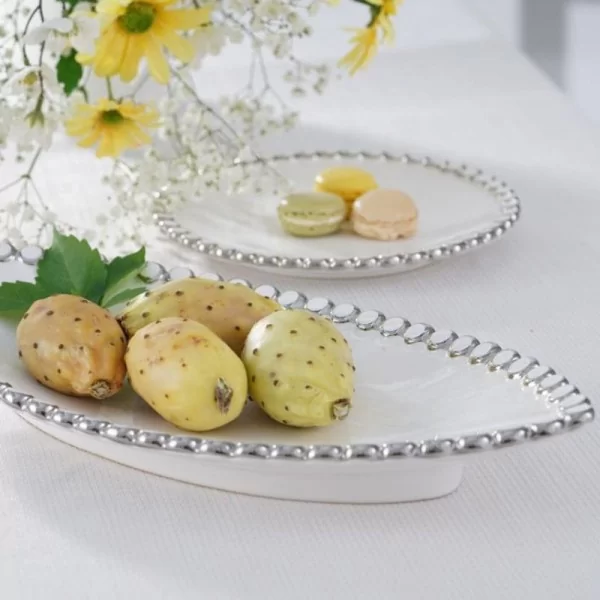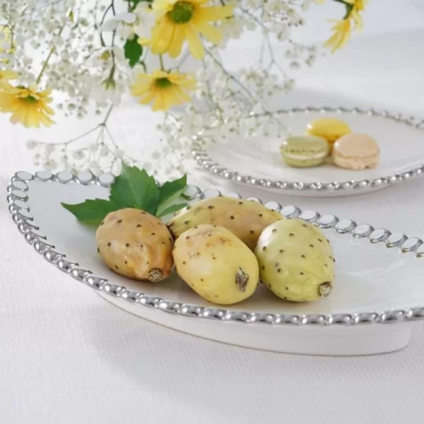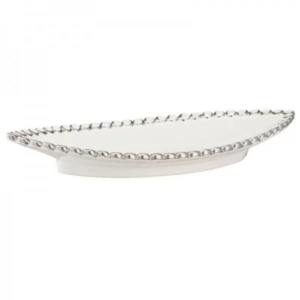 Niezwykle dekoracyjny półmisek, doskonały na owoce. Jego nietuzinkowe wzornictwo i elegancki wygląd sprawia, że wspaniale ozdobi komodę lub stół. Naczynie jest w kształcie łódki o długości 40 cm i szerokości 19 cm. Jego wysokość wynosi maksymalnie 5 cm.