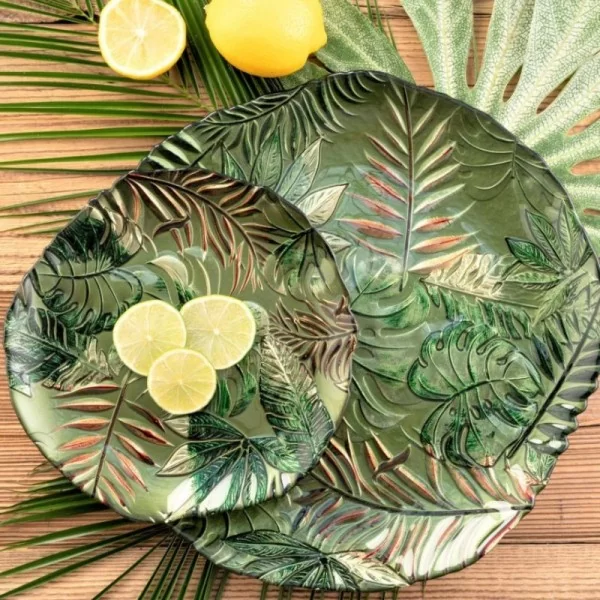 Zielona salaterka i inne elementy zastawy szklanej z serii AMAZON, zdobionej motywem roślin tropikalnych, ożywią Twoje wnętrza, dodadzą im świeżości i wprowadzą wakacyjny klimat.