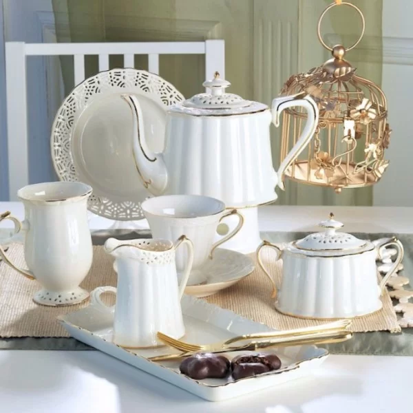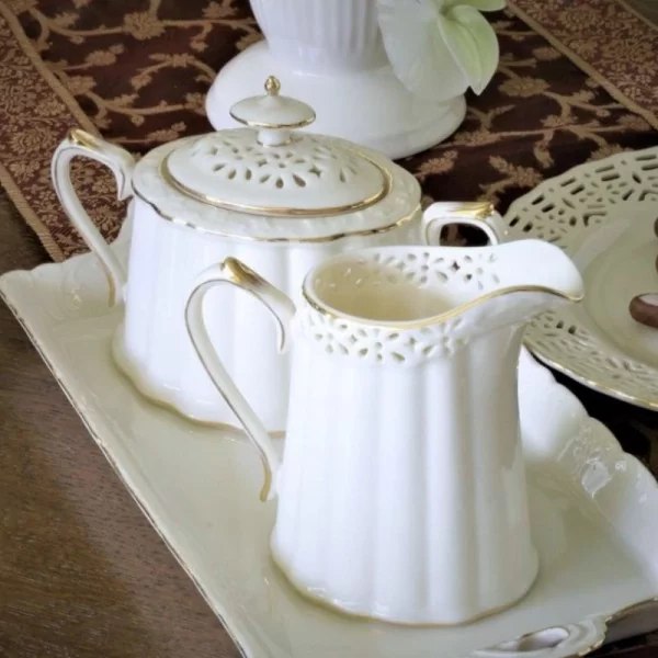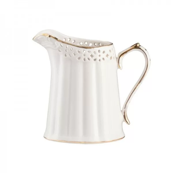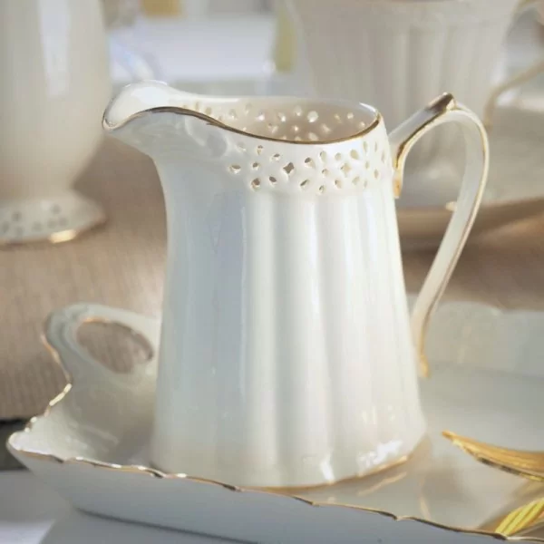 Przepiękny mlecznik o unikatowym kształcie, z kolekcji porcelany kremowej w klasycznym fasonie. Niezwykle elegancki mlecznik i pozostałe elementy kolekcji wyróżniają się przepięknym wysmukłym kształtem, podkreślonym delikatnym tłoczeniem oraz misterną, ażurową koronką wykonaną ręcznie. Lekkości i uroku dodaje kolekcji ręcznie malowana złota linia na obrzeżach oraz stopki filiżanek i kubeczków.