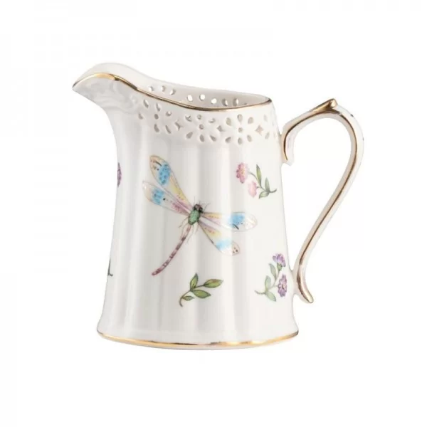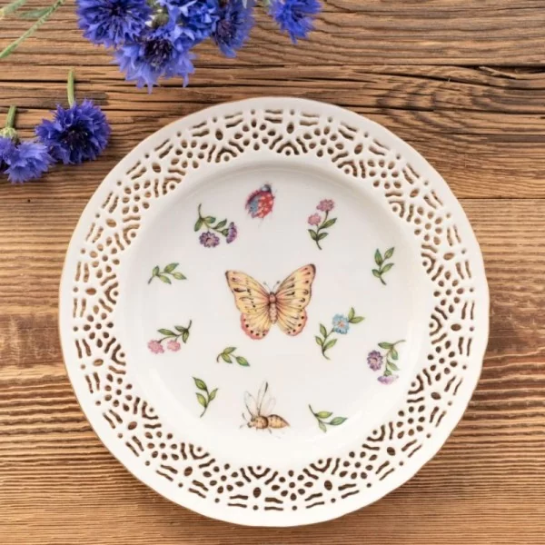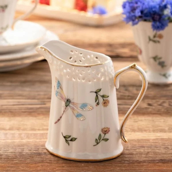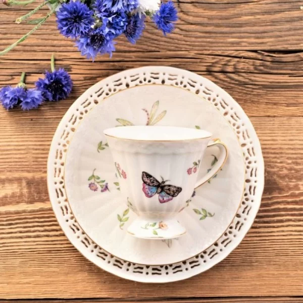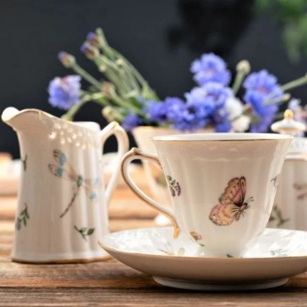Serwis do herbaty lub kawy z kolekcji porcelany LEDA Ivory, w śmietankowym odcieniu bieli i klasycznym fasonie. Porcelana dekorowana jest radosnymi ogrodowymi motywami (kwiatki, motyle, ważki, owady).