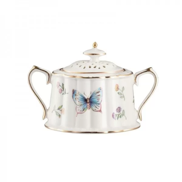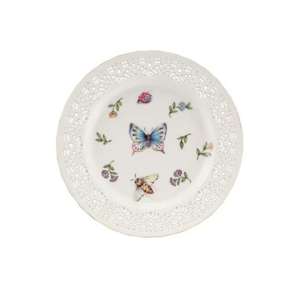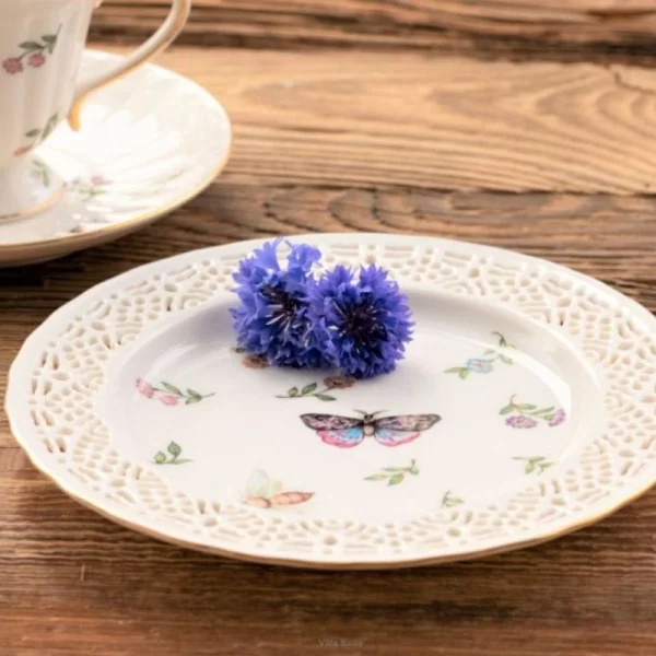 Niezwykle elegancki serwis do herbaty LEDA Ivory wyróżnia się smukłym kształtem naczyń, podkreślonym delikatnym tłoczeniem oraz misterną ażurową koronką wykonaną ręcznie. Porcelana dekorowana jest radosnymi ogrodowymi motywami (kwiatki, motyle, ważki, owady). Każdy element zastawy ma inny wzór dekoracji, dzięki czemu jest wyjątkowy. Lekkości i uroku dodaje kolekcji ręcznie malowana złota linia na obrzeżach oraz stopki filiżanek i kubków. W skład zestawu wchodzi m. in. porcelanowa taca, doskonała jako talerz do ciasta. Ażurowe przykrywki dzbanka i cukiernicy posiadają dodatkową warstwę porcelany.