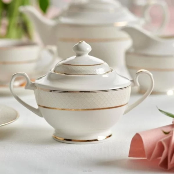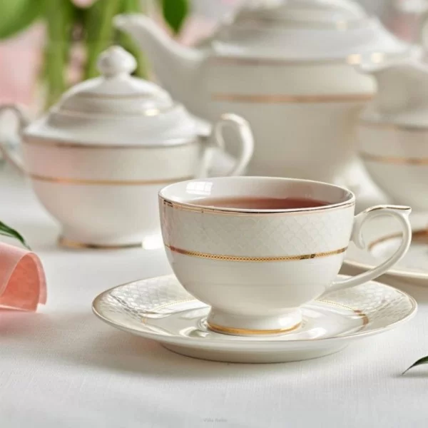 Serwis kawowy Celine to elegancka zastawa w klasycznym fasonie. Naczynia wykonane są z porcelany kostnej w ciepłym odcieniu bieli. Dekorowane subtelnym wzorem łusek, podkreślonym złotymi paseczkami. Charakteru i lekkości dodają naczyniom stopki oraz stylizowane uchwyty, również z delikatnymi, złotymi zdobieniami.