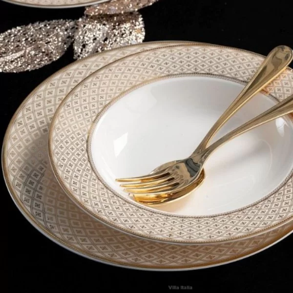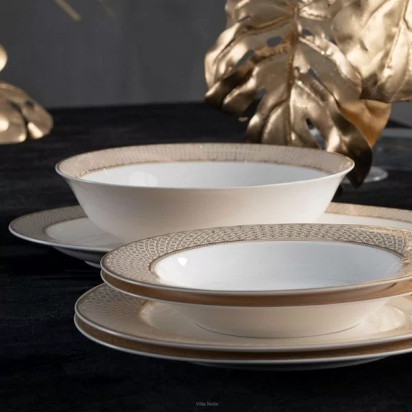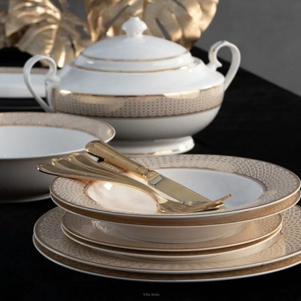 Serwis obiadowy Veronica to zastawa porcelanowa w klasycznym fasonie. Charakteru i lekkości dodają naczyniom stopki oraz stylizowane uchwyty. Zastawa Veronica wykonana jest z porcelany kostnej w ciepłym odcieniu bieli. Jest bogato dekorowana misternym, złotym wzorem na szerokim pasku o kremowym tle. Dodatkowo obrzeża, uchwyty i stopki naczyń zostały wykończone złotą linią.