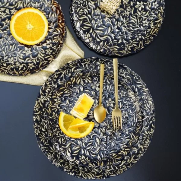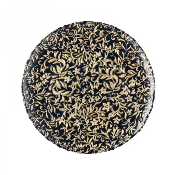 ALTAR to linia oryginalnych naczyń szklanych do ciasta w bardzo ciemnym, prawie czarnym odcieniu granatu. Naczynia zdobi tłoczony i malowany wzór roślinny. Dekoracja naniesiona jest od spodu, dzięki czemu talerze mają gładką i łatwą do mycia powierzchnię.