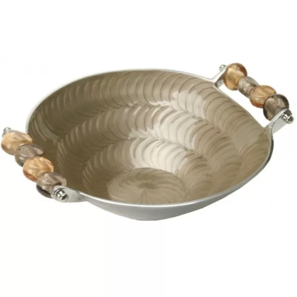 Salaterka z uchwytami, z kolekcji ręcznie dekorowanych wyrobów metalowych marki Villa Italia. Naczynie charakteryzuje się oryginalnym wzornictwem. Perłowe wykończenie wraz ze szklanymi ozdobami na uchwytach sprawiają, że misa prezentuje się niezwykle efektownie.