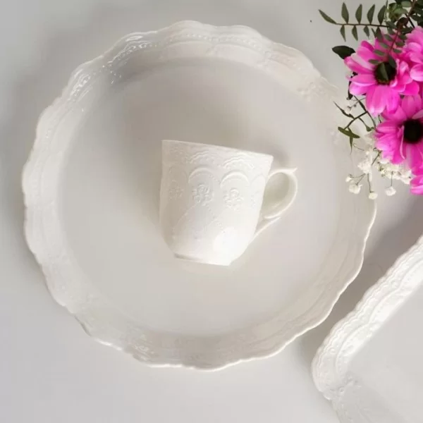 Aurelia to porcelana w klasycznym stylu o mlecznym odcieniu bieli. Charakterystyczną cechą kolekcji są falowane brzegi talerzy. Lekkość formy naczyń podkreślona jest delikatnym ozdobnym reliefem.