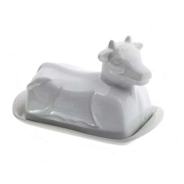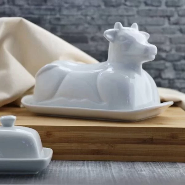 Maselniczka z pokrywą w kształcie krowy to urocze i funkcjonalne naczynie do serwowania masła. Klasyczny biały kolor porcelany oraz ciekawy design sprawiają, że doskonale wpasowuje się w każdą aranżację stołową, dodając zabawnego akcentu do codziennych posiłków.
