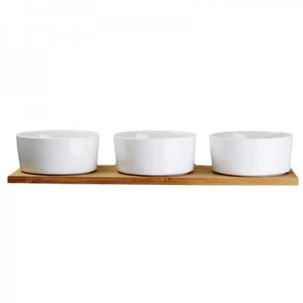 Świetne rozwiązanie dla każdego miłośnika sosów, dipów i przekąsek. Zestaw składa się z trzech miseczek umieszczonych na podłużnej bambusowej podstawie, która ułatwia serwowanie.