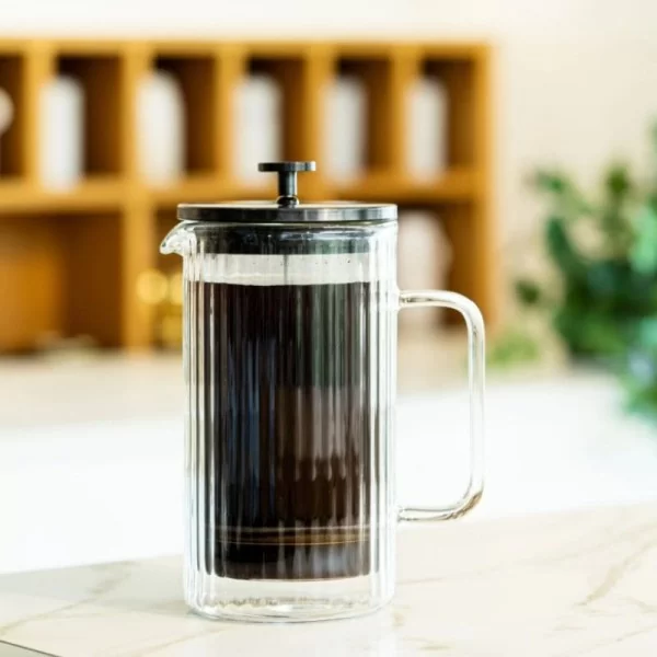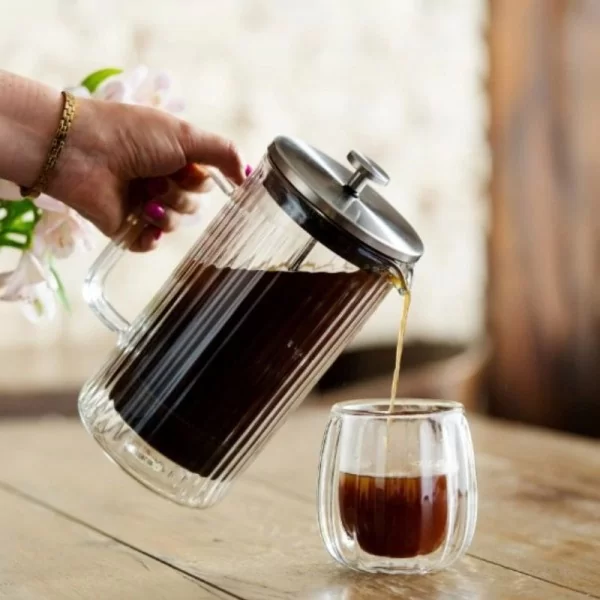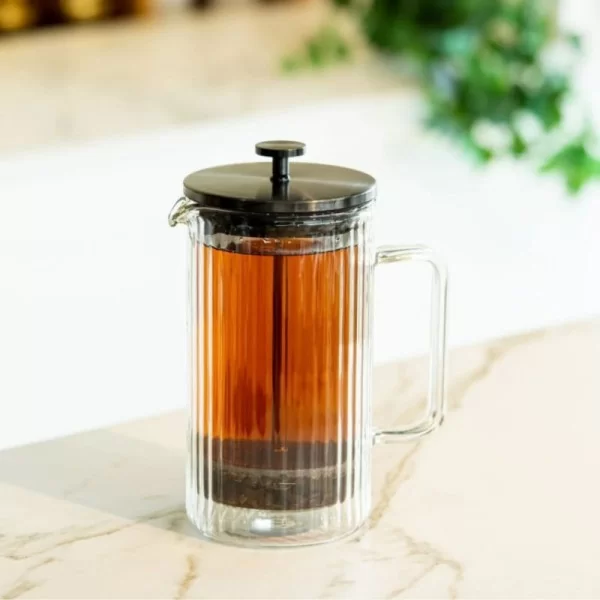 Zaparzacz wykonany z najwyższej jakości szkła borokrzemowego nie tylko pięknie się prezentuje, ale także jest wyjątkowo trwały i odporny na nagłe zmiany temperatury. Ścianki z podwójnego szkła utrzymują optymalną temperaturę napoju na dłużej, podczas gdy duże, wygodne ucho zapewnia komfort podczas użytkowania.