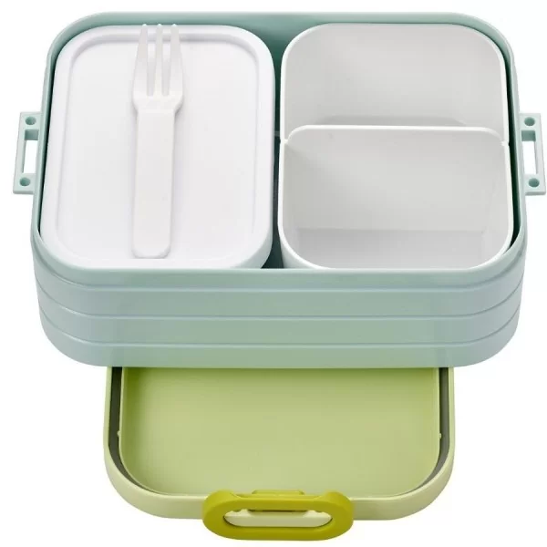 - w środku wyposażony w wyjmowane wkłady, jeden - w formie zamykanego pudełeczka doskonały na sos, zupę krem lub pastę o pojemności 300 ml, drugi - przedzielony na dwie części pozwoli na odseparowanie sałatek lub przekąsek czy też owoców.