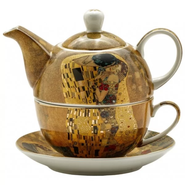 Oryginalny komplet z porcelany składający się z dzbanka o pojemności 350 ml oraz filiżanki o pojemności 280 ml (pojemność liczona po rant filiżanki) z talerzykiem ozdobione motywem z obrazu Gustava Klimta "The Kiss". W zestawie również zaparzacz ze stali nierdzewnej. W trakcie parzenia herbaty dzbanek można pozostawić na filiżance aby ją ogrzać, w ten sposób herbata na dłużej pozostaje ciepła.