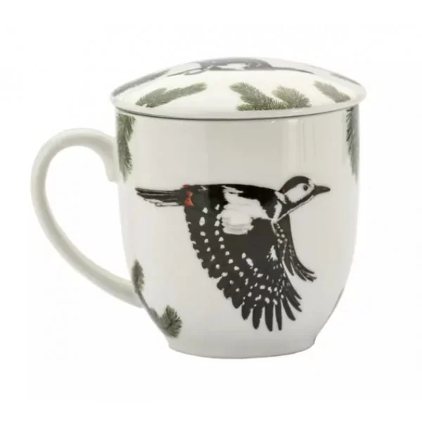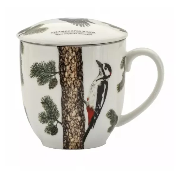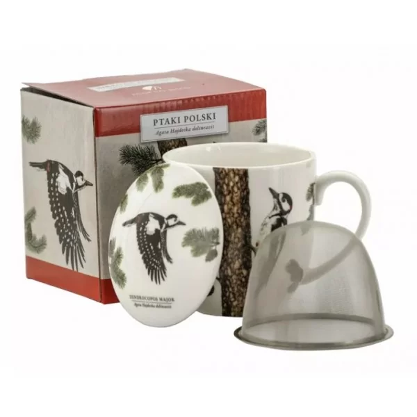 Zestaw kubek z zaparzaczem i pokrywką z serii Ptaki Polski by Agata Hajdecka. Wykonany z najwyższej jakości porcelany. Kubek ozdobiony motywem Dzięcioła Dużego na białym tle. Wzory ptaków umieszczonych na kubkach zostały wykonane przez polską projektantkę graficzną i ilustratorkę Agatę Hajdecka, laureatkę wielu ogólnopolskich konkursów plastycznych. Inspiracje do cyklu ptasich ilustracji zostały zaczerpnięte ze starych rycin książkowych.