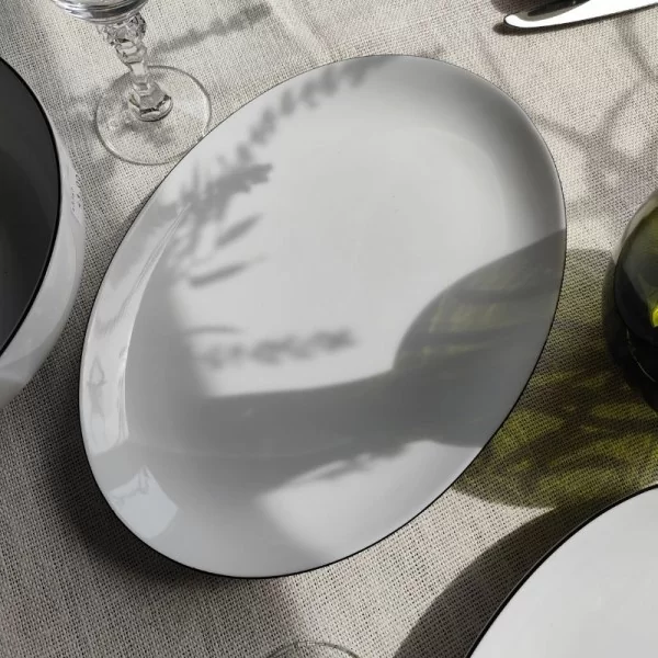 Porcelanowy półmisek owalny z kolekcji Base Black marki Bogucice, zdobiona delikatnym czarnym paskiem na obrzeżu.