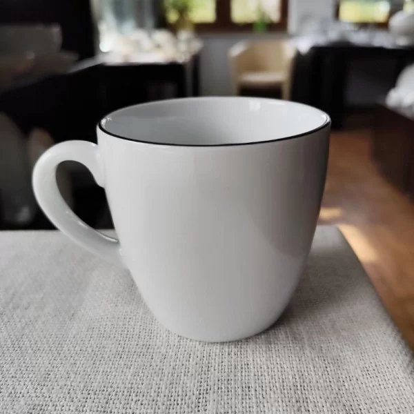 Porcelanowy kubek z kolekcji Base Black marki Bogucice, zdobiona delikatnym czarnym paskiem na rancie.