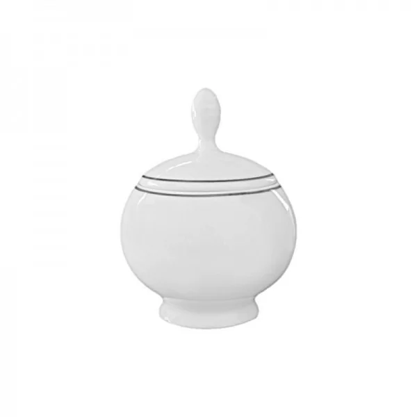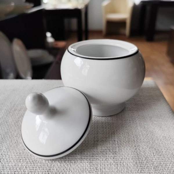 Porcelanowa cukiernica z kolekcji Base Black marki Bogucice, zdobiona delikatnym czarnym paskiem na rancie.